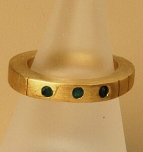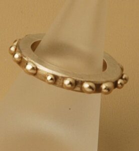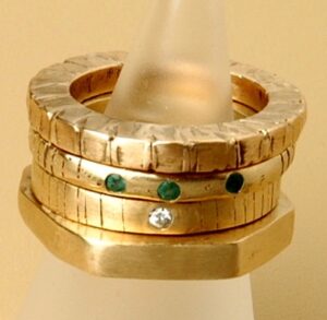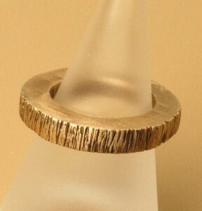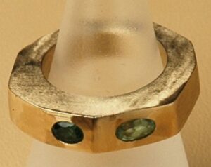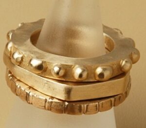 Thomas’ rings are deliberately devoid of excessive polishing to avoid the shiny appearance of new, commercial jewelry. Instead, primitivism and raw power are emphasized. Janice says, “I like them to look like they are ancient and have been just unearthed from an archaeological dig, like a beautiful relic from a lost civilization, perhaps classical Greece and Rome, or even the time of the Etruscans or King Henry V. And I design them to appear primitive. I do not draw a perfect straight line; therefore none of my rings are perfectly carved – they are defiantly hand shaped, hand-made by me via an intricate lost wax process, which involves 20 to 25 steps. No two rings will ever be the same.”