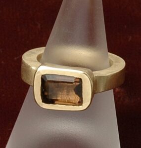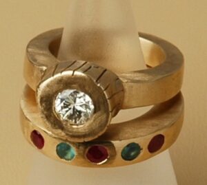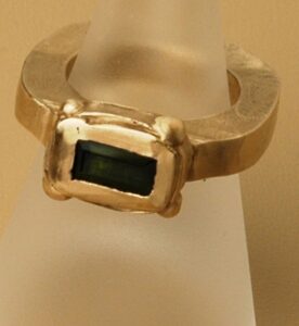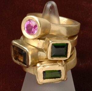 Thomas’ talents do not stop with creating clothing – she also forays into the world of jewelry design. Her specialty: hand crafted rings formed from precious metals and gemstones. For metals, Janice’s rings emphasize 14K, 18K and 22K gold, employed in varying combinations and set with stunning stones (both precious and semi-precious) including tourmalines and emeralds (often used as the primary gemstones) as well as diamonds, smoky topazes, blue sapphires and pink sapphires.