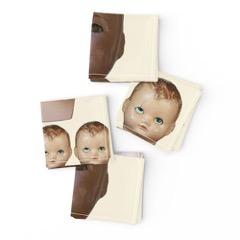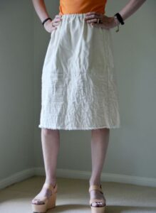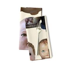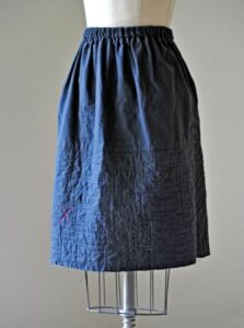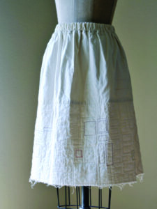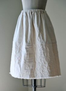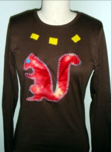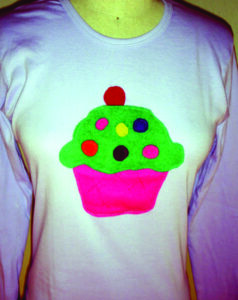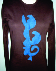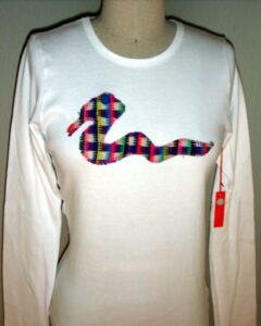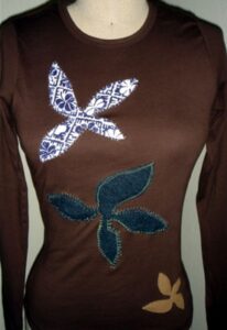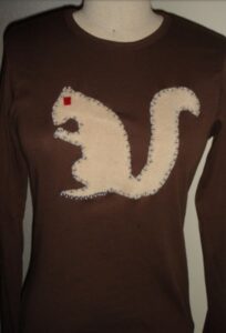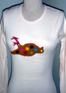 Thomas uses old feed sacks from the 1930’s and vintage fabric from the 1940’s and then hand-cuts these materials into abstract designs and stitches them onto her tees. All her designs in each collection are one of a kind; no two will ever be exactly alike. Also employed are organic, dyed felted wool, which she cuts into cartoon-inspired animals and then hand appliqués via an array of different stitches.